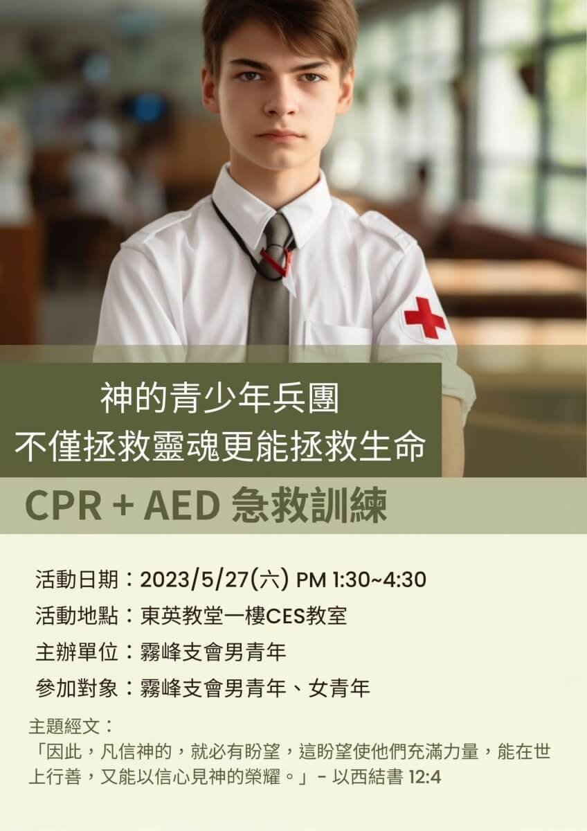 所以我們的青少年在2023-05-27(六) PM 1:30~4:30 在東英教堂一樓CES教室,舉辦一個「CPR+AED急救訓練」的青少年活動。