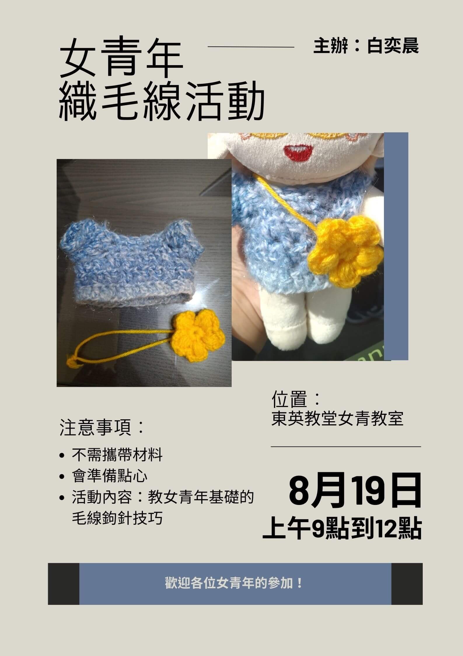 2023-08-19(六) AM9:00~PM12:00 我們在東英教堂二樓女青年教室。舉辦一個「女青年織毛線活動」。期望能透過這次活動教會女青們毛線的基礎織法,引起興趣,讓她們能在日後織其他作品時更順暢,同時增加女青年們的耐心。