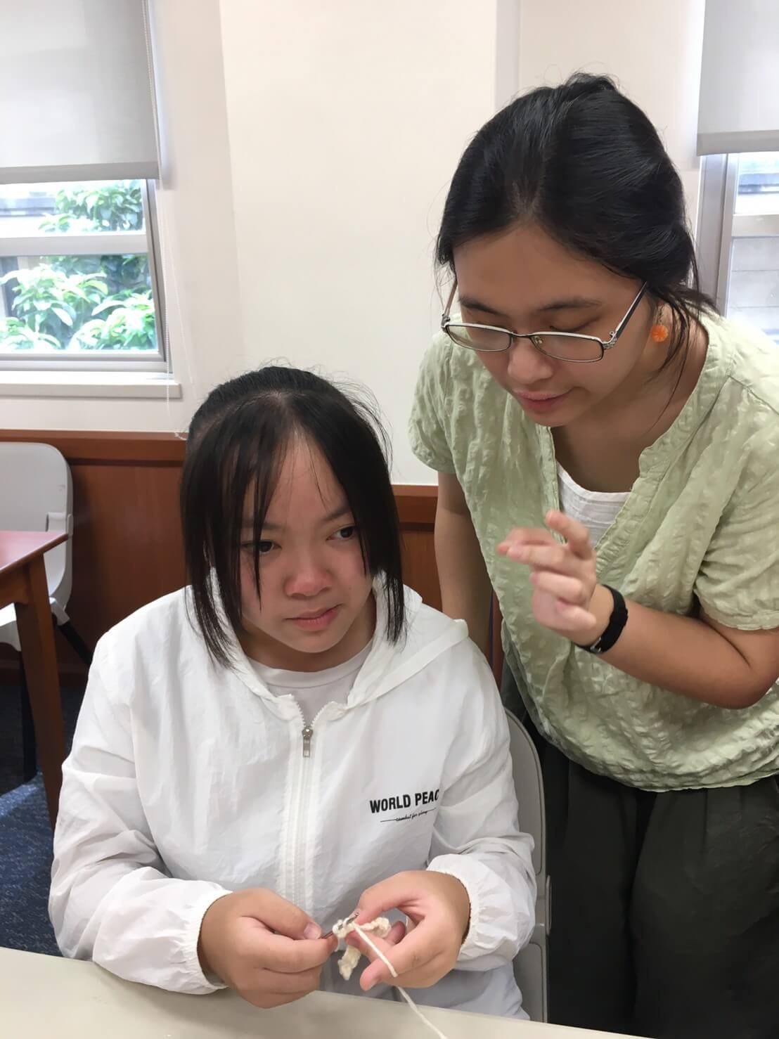 雖然如此,依然有充滿天分的女青年,像是本日MVP石姊妹,順利織完活動所教的五種織法。